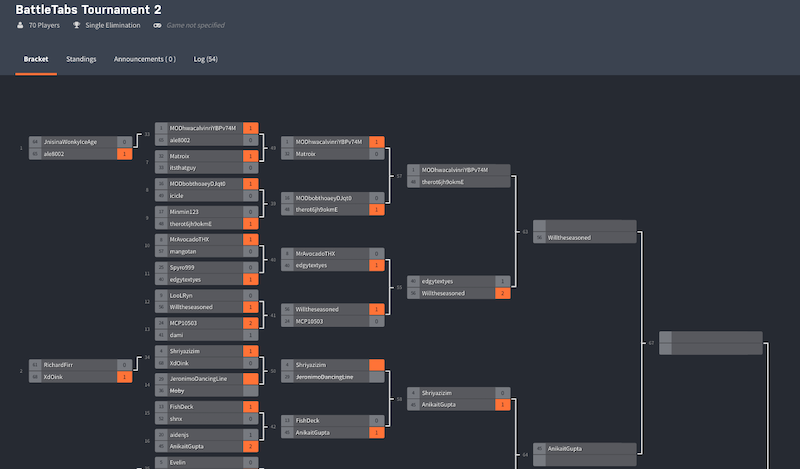 Our second tournament continues! From 70 players now down to the Sweet Sixteen round, it’s been an exciting week for participants and observers. Follow along on the Discord channel, check out the match result page, and see the tournament bracket progress.